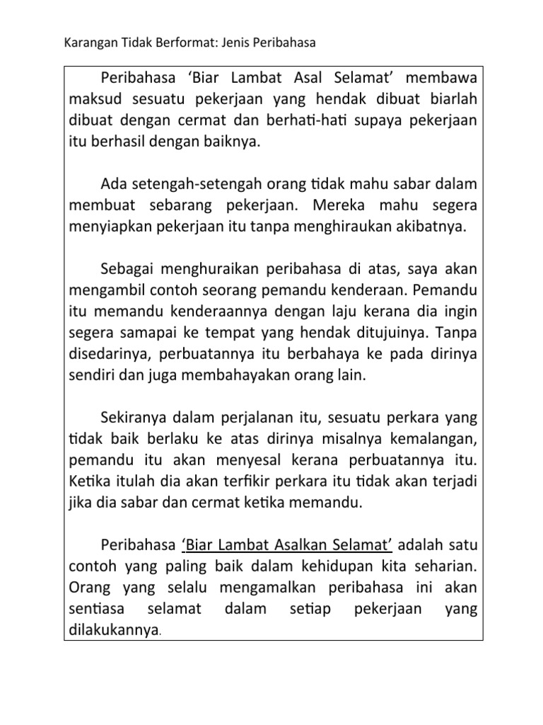 Buku Teks Digital Bahasa Arab KSSM Tingkatan 5. FORMAT TIDAK BERFORMAT BERITA PERIBAHASA SURAT KIRIMAN CERITA SYARAHAN fPendahuluan- maksud peribahasa Biar Lambat Asalkan Selamat Maksud peribahasa Penutup-contoh yang penting dalam kehidupan Biar Lambat Asalkan Selamat Ada orang yang tidak sabar Kesan tidak sabar Contoh situasi fPERIBAHASA. Apr 27 2022 ada 2 kategori bagi karangan bahasa melayu ini iaitu karangan berformat dan juga karangan tidak berformat.